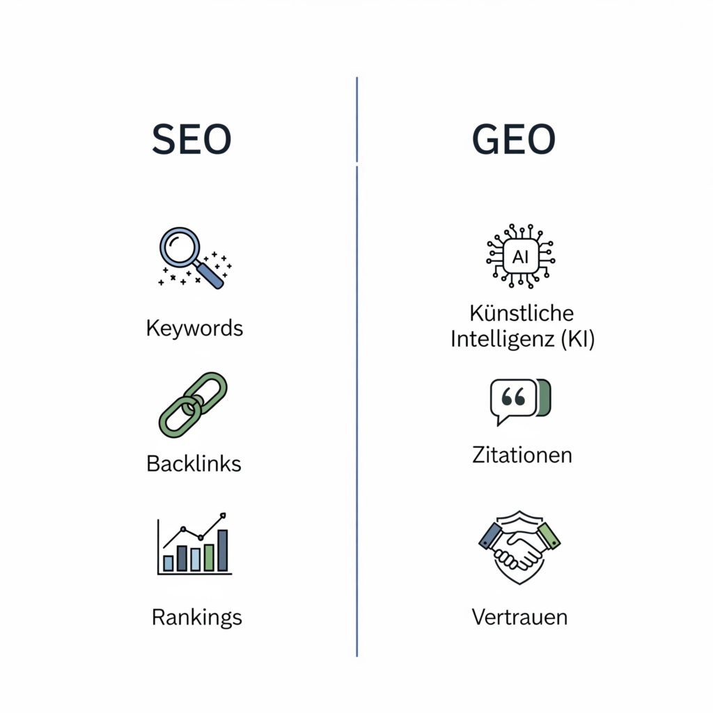 Während SEO darauf abzielt, deine Website in den klassischen Suchergebnissen (blaue Links) nach oben zu bringen, optimiert GEO deine Inhalte dafür, von KI-Modellen wie ChatGPT oder Google Gemini als Quelle zitiert zu werden. SEO bringt Klicks, GEO bringt Autorität in der KI-generierten Antwort-Welt.